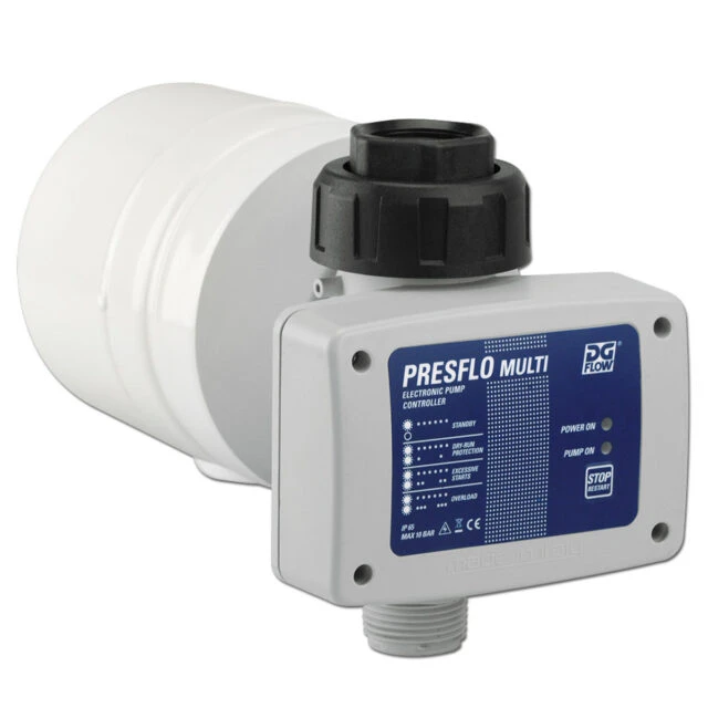 The PresFlo electronic pressure flow regulator starts/stops the pump based on demand. It is capable of satisfying the most varied of needs while guaranteeing the pump works reliably and safely. It substitutes a traditional pressure switch/surge tank system while offering reduced dimensions, no maintenance requirements, constant flow and pump protection.