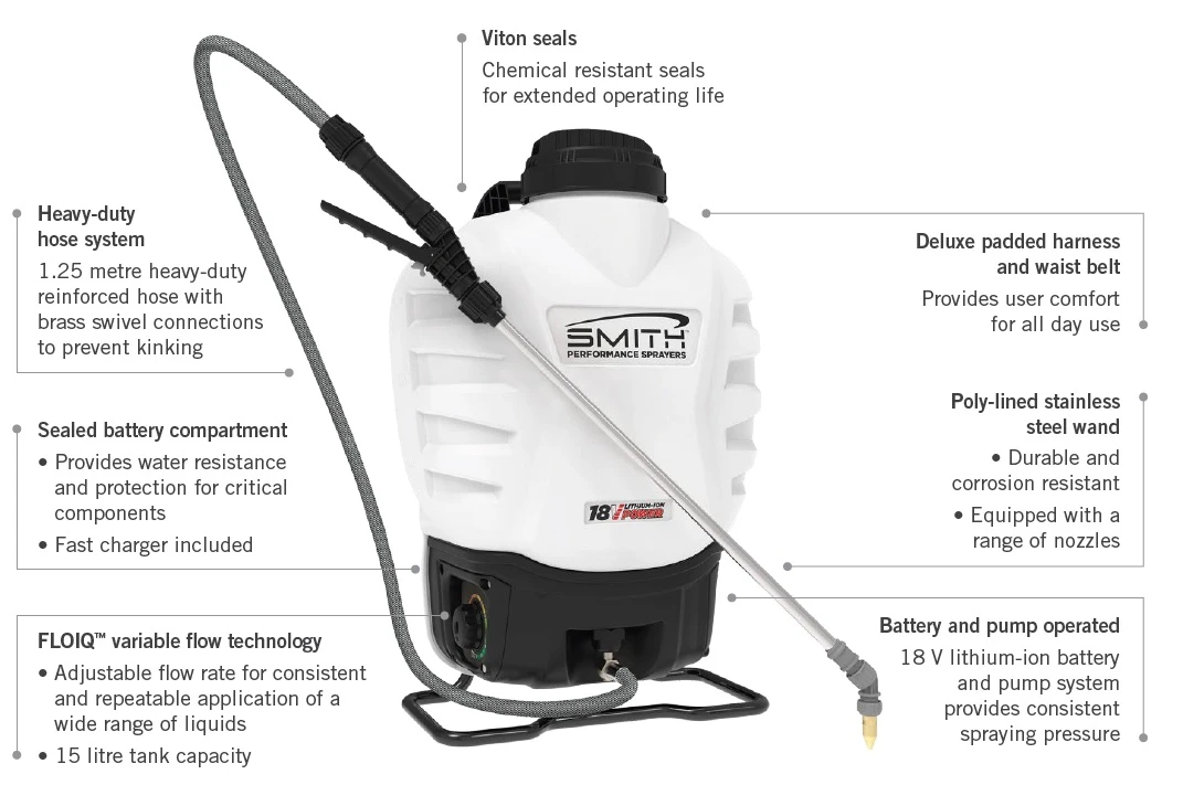 The Smith Performance Sprayers Heavy-Duty Backpack Sprayer is a multi-use professional sprayer that combines versatility and performance. Equipped with an 18 V lithium-ion battery and FLOIQ variable flow technology, this powerful unit can pump up to 190 Litres of liquid per charge whilst maintaining consistency throughout each application.
